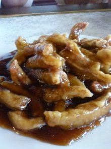 冷菜の「涼伴茄子」は、ニンニクたっぷりの芝麻醤味、それと「糖醋里脊」。