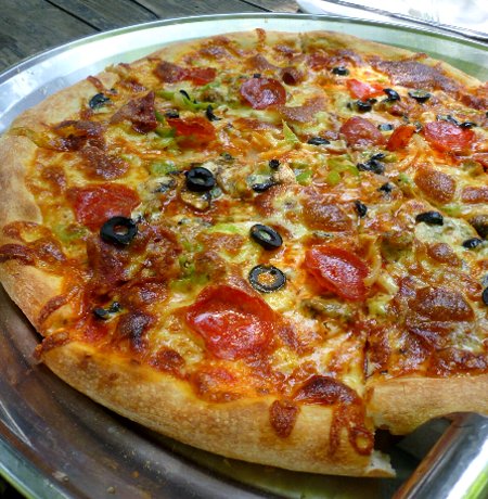 スポーツ後に木漏れ日のなかで頬張る焼き立てピザ 最高です。