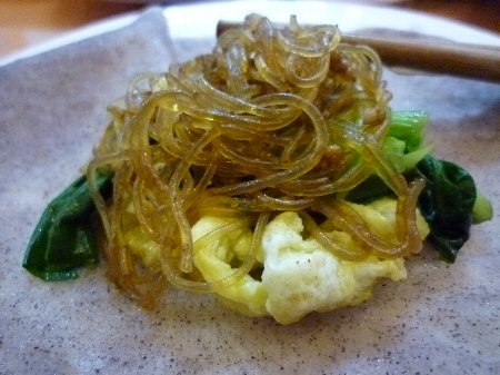 豚肉の醤油煮や春雨、卵、もやしなどの炒め物をお好みでのせて巻いて食べるものです。